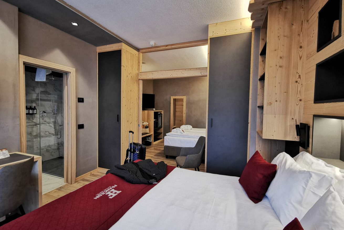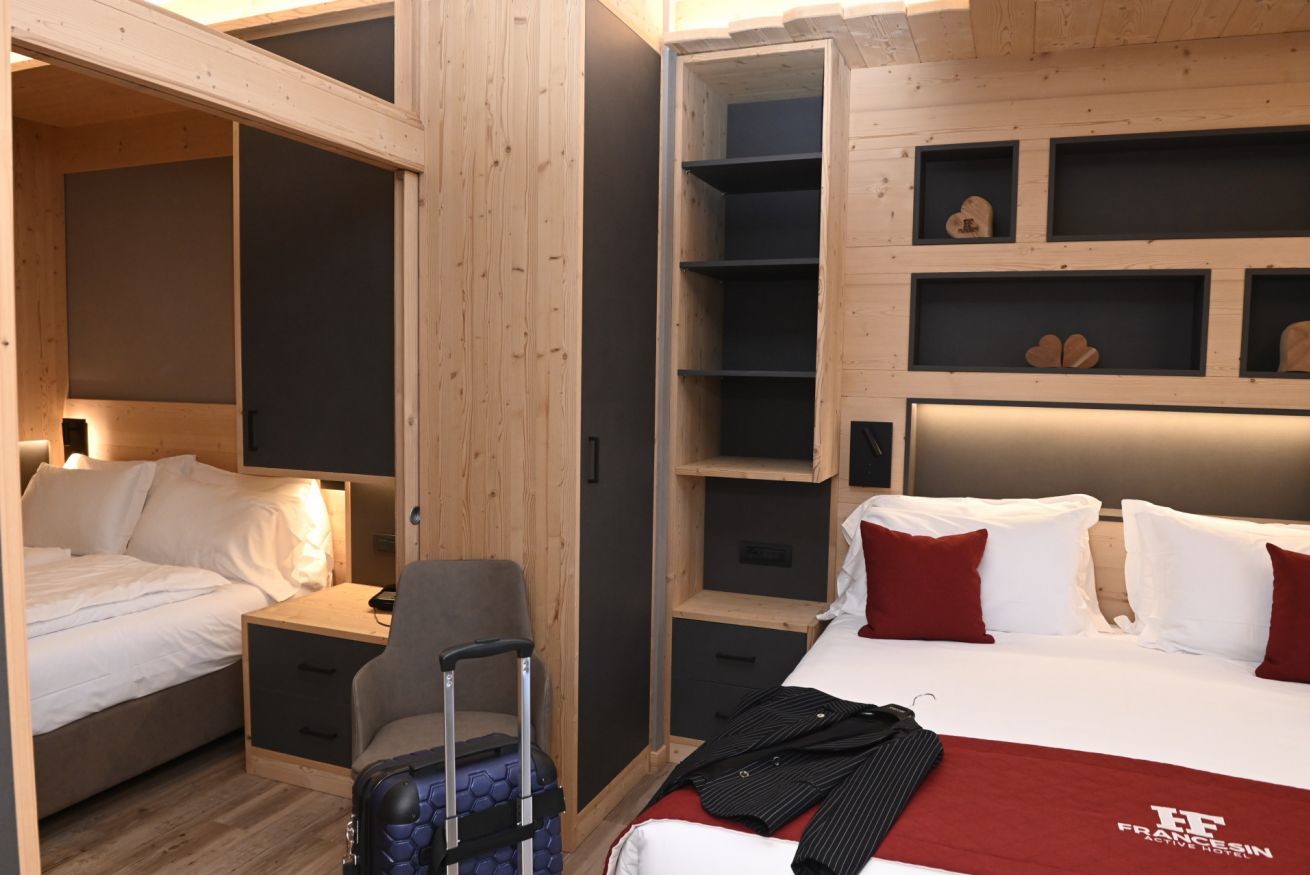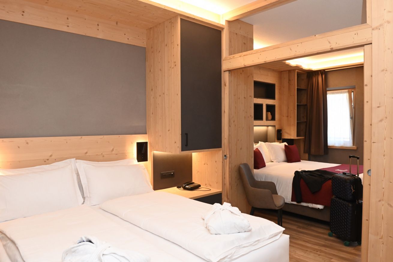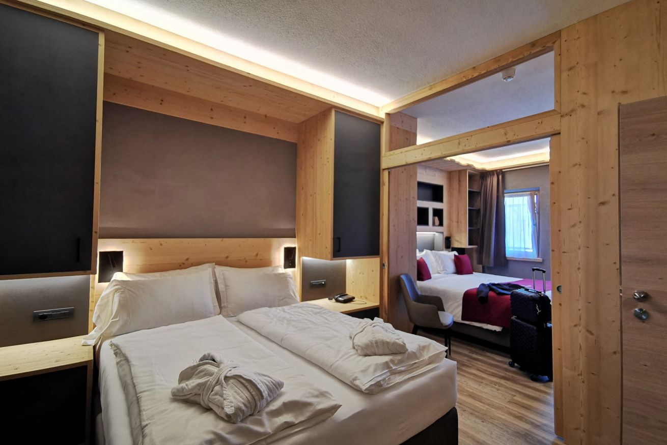 La camera familiare superior è la soluzione ideale per una famiglia con 2 bambini. La stanza ha una dimensione di circa 23mq, separabili da una porta scorrevole che divide la stanza ed è situata al primo piano dell’hotel.
