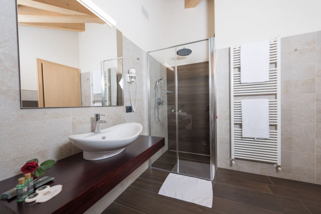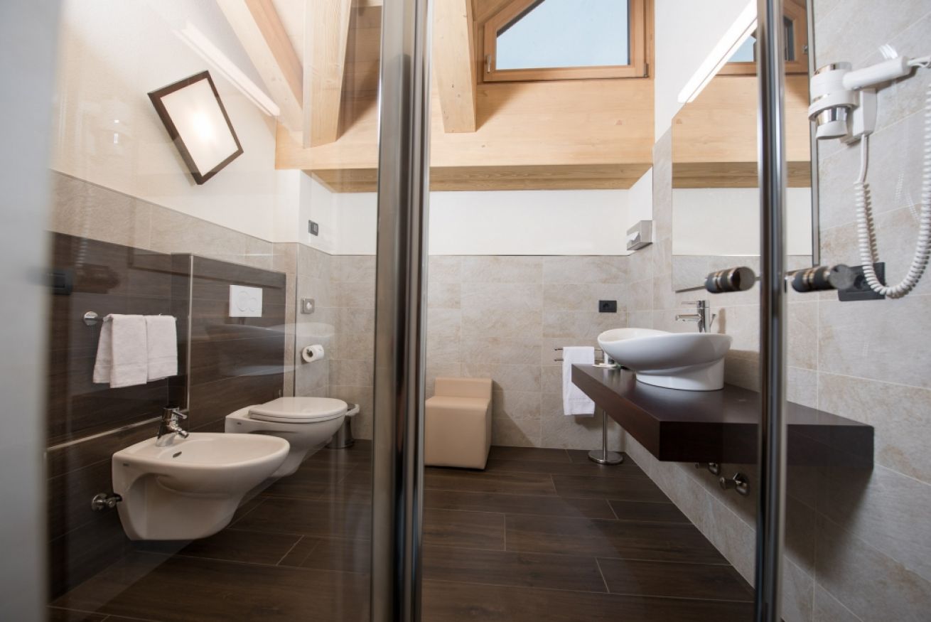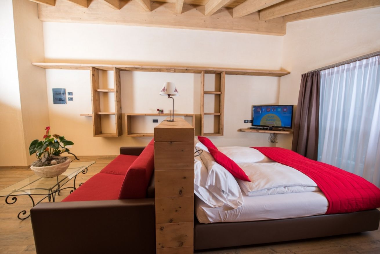 La Suite con Sauna ad Infrarossi si trova al 3° piano della struttura e ha una dimensione di circa 35 mq. E’ la soluzione perfetta per una coppia che vuole godersi le sue vacanze in montagna senza rinunciare agli spazi, oppure ad una famiglia con massimo 2 bambini. Grazie al suo ampio balcone con vetrate di 3 metri, potrete godere di meravigliose vedute sulle nostre montagne.